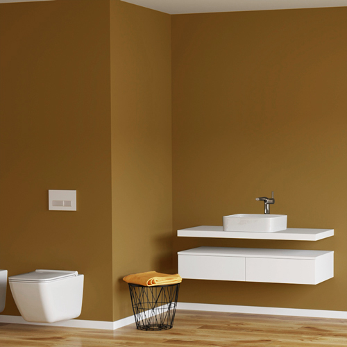 Wenn Sie die Symmetrie in Ihrem Badezimmer bewahren wollen, eignet sich besonders dazu die Kombination von unserer designvollen Waschtischplatte mit glänzenden Konsolen in Stahloptik mit Aufsatzwaschtisch und einer schlanken Abdeckplatte mit zwei nebeneinander gelegten Schubladen mit sanfter Dämpfung.