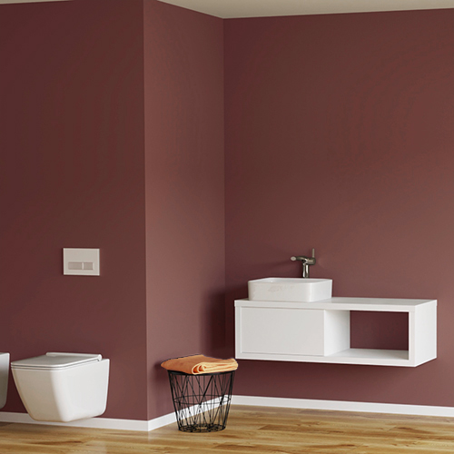 Unser moderner wandhängender Waschtischunterschrank hat eine Schublade und eine Nische nebeneinander, mit dem Waschtisch über der Schublade. Die Nische, sowie die darüberliegende Fläche bieten zusätzlichen Ablage- und Stauraum. Der Schrank kann mit über 30 verschiedenen Farben und Mustern wie unsere Stein- oder Massivholzoptik personalisiert werden.