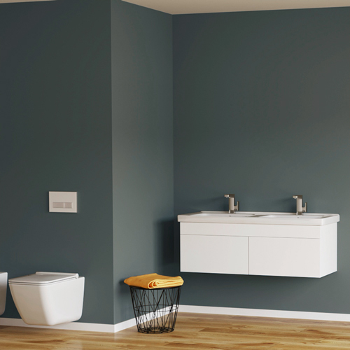 Erhaltene Symmetrie bei dem Waschtischunterschrank mit Frontblende und zwei Schubladen mit Soft-Close und Push-to-Open, die nebeneinander gelegen sind, ist ein Grund für klare Linienführung mit anspruchsvollem Design.