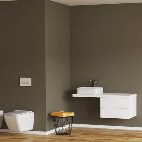 Diese moderne 48mm hohe Waschtischplatte hat ein Aufsatzwaschbecken links, und eine Ablage mit zwei untereinanderliegenden Schubladen an der rechten Seite. Um die Platte zü personalisieren, können Sie beim Kauf von über 30 verschiedenen Farben und Mustern auswählen, oder einen Schrank nach Maß bauen lassen.